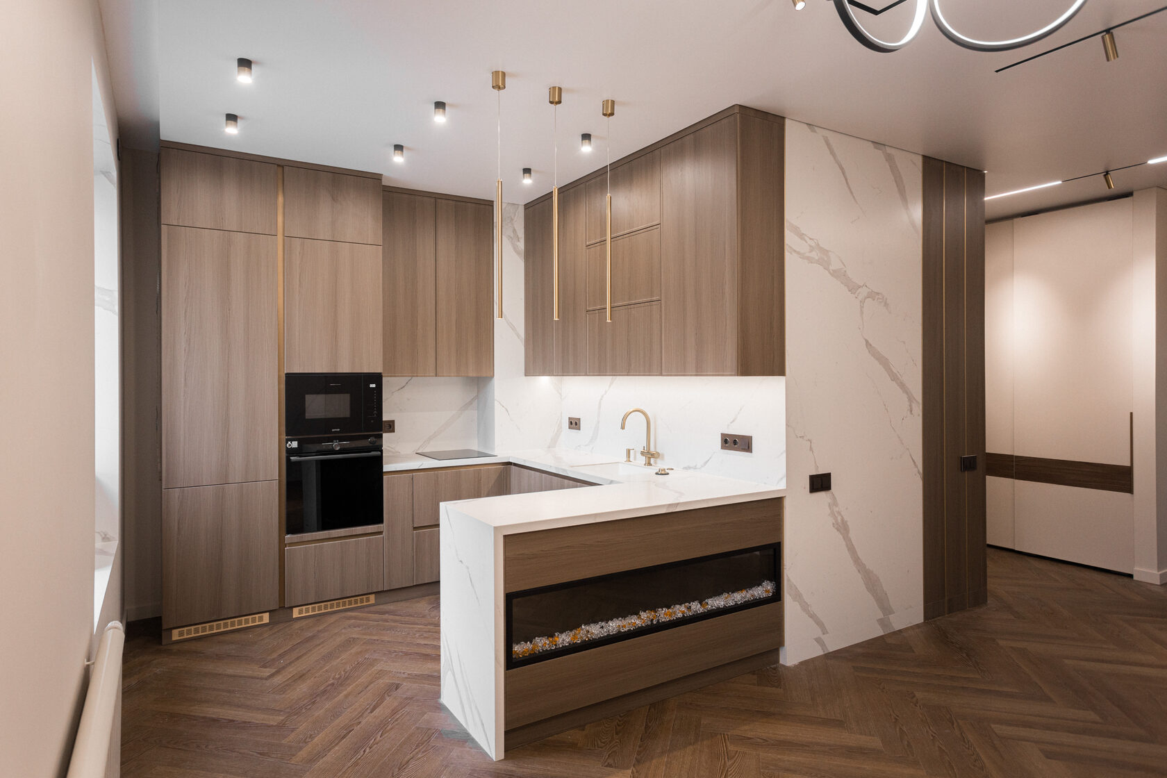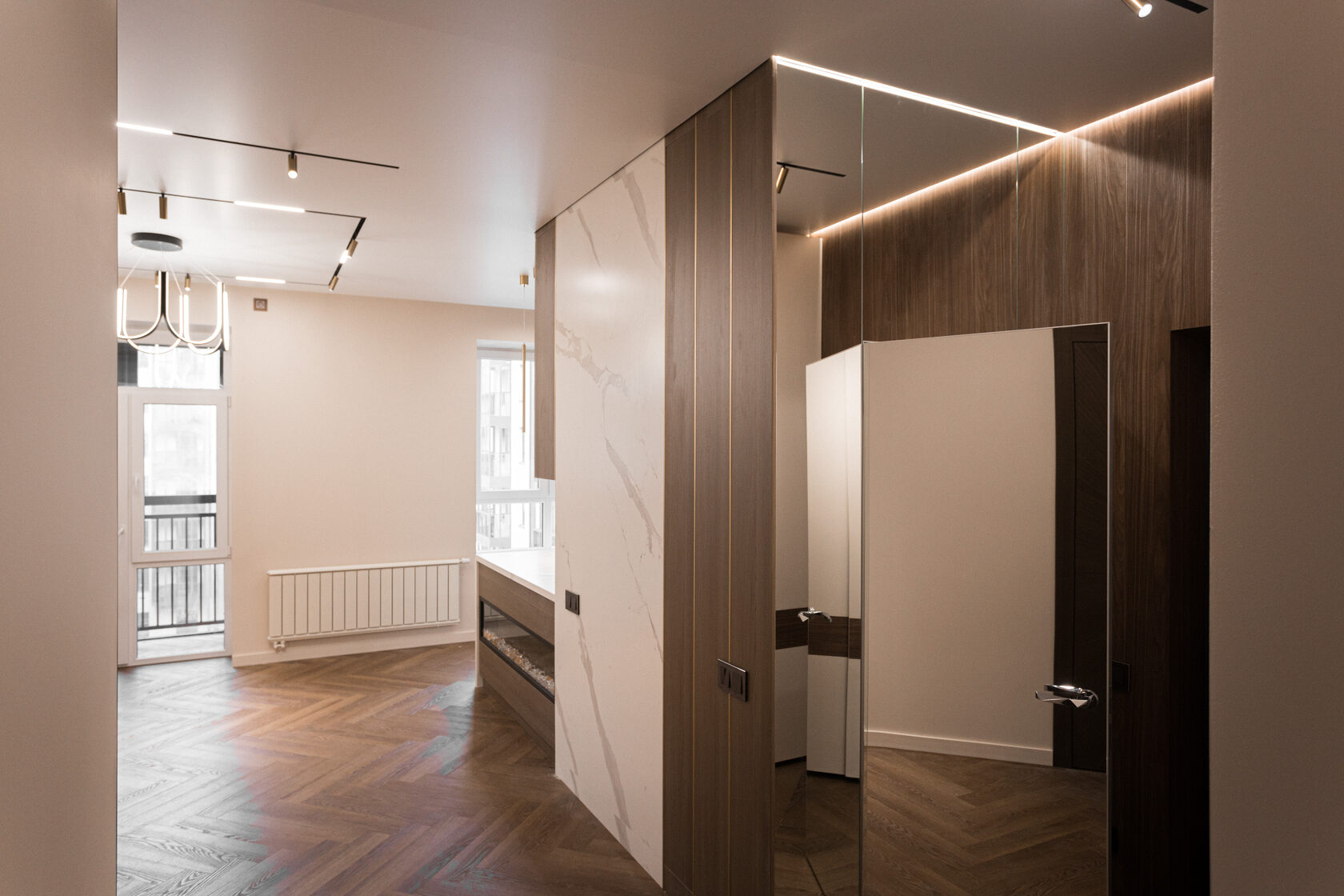 Работы проводились на основе стороннего дизайн-проекта. Наша команда взяла на себя инженерную доработку и архитектурное сопровождение, сохранив авторский стиль и добавив пространству логики, света и тепла.