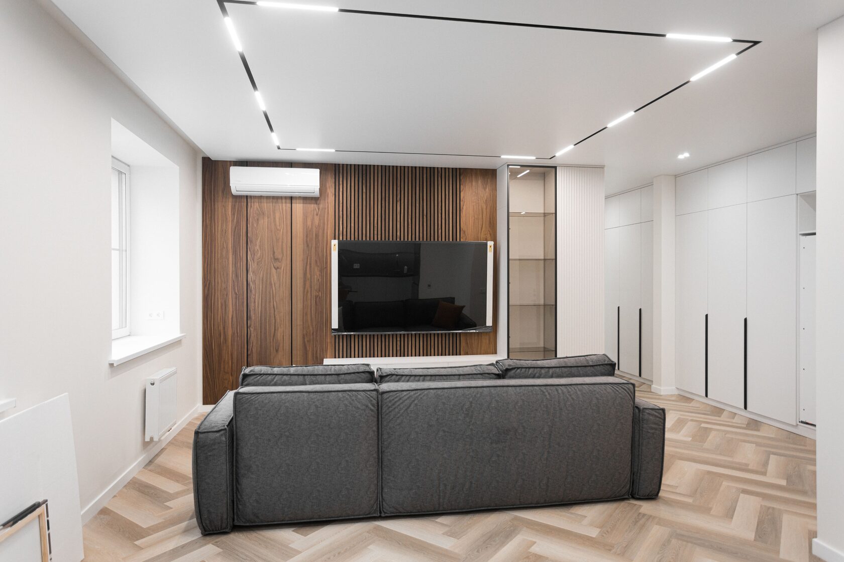 Перед нами стояла задача сохранить воздух и легкость, при этом спрятав всё лишнее. Скрытые системы хранения здесь выверены до миллиметра — они работают как швейцарские часы, оставаясь незаметными глазу. Помещение, отведенное под будущую детскую, сегодня используется как многофункциональная комната, полностью готовая к трансформации при первой необходимости.